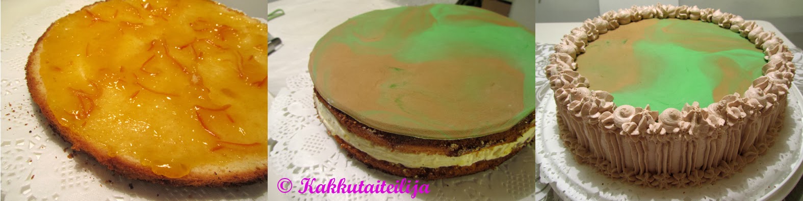Kakun pintaan halusin vähän maanpintamaisen olemuksen ja niinpä värjäsin vaahtokarkin makuista kaulintamassaa pienemmän osan vihreäksi ja isomman osan ruskeaksi ja sitten yhdistin massat kevyesti yhteen puristellen ja kaulin sen levyksi, jolloin tuli vähän marmorimainen lopputulos. Kakkupohjan ja pintalevyn väliin laitoin kiinnikkeeksi samaista appelsiinihilloa, kuin kakun välissäkin.